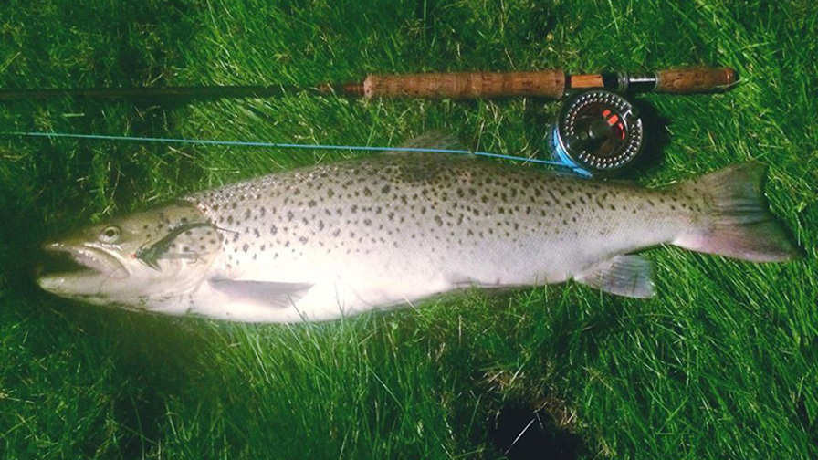 Lørdag den 21. januar skulle der kun gå en time med fluestangen før en tung havørred klapper sine kæber om fluen, Red Tag Palmer, som Rasmus fisker med. En kort, men hektisk fight med flere spring resulterer i årets første havørred på land.