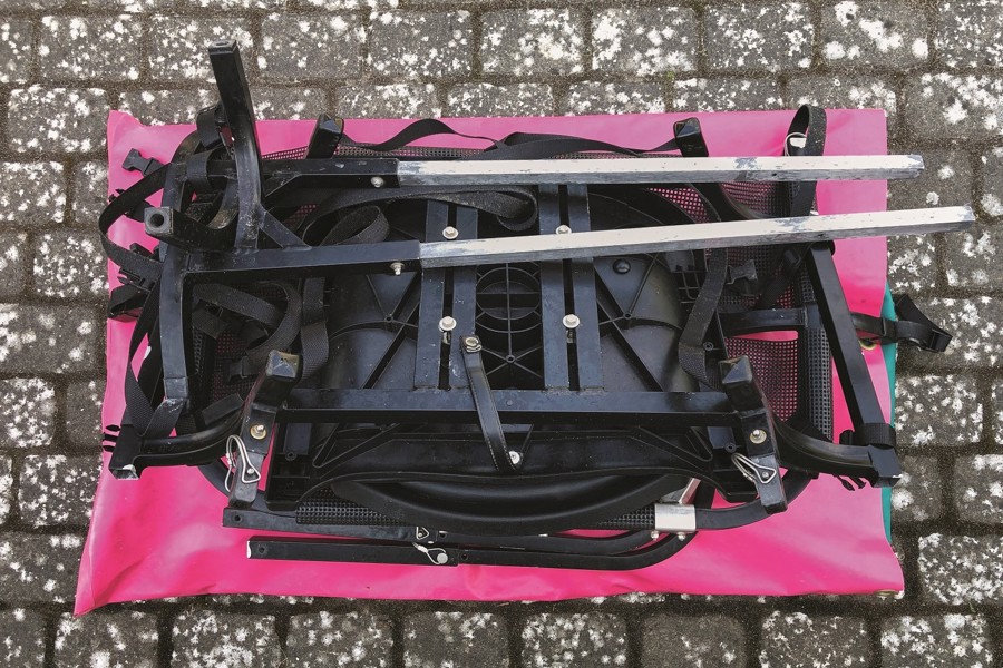 Ud til pladsen har jeg flyderingen i bilen uden luft. Siderne kan hægtes sammen med karabinhager, så den ikke fylder ret meget. Herefter tager jeg den på ryggen med de medfølgende seler. Finnerne stikker jeg ned bag skumsædet, men man skal huske at fastgøre dem til ringen, for de kan godt smutte ud. Fremme på fiskepladsen skal man enten tage selerne af eller stramme dem op. Ellers kan man hænge fast i bunden, hvis man er uheldig.