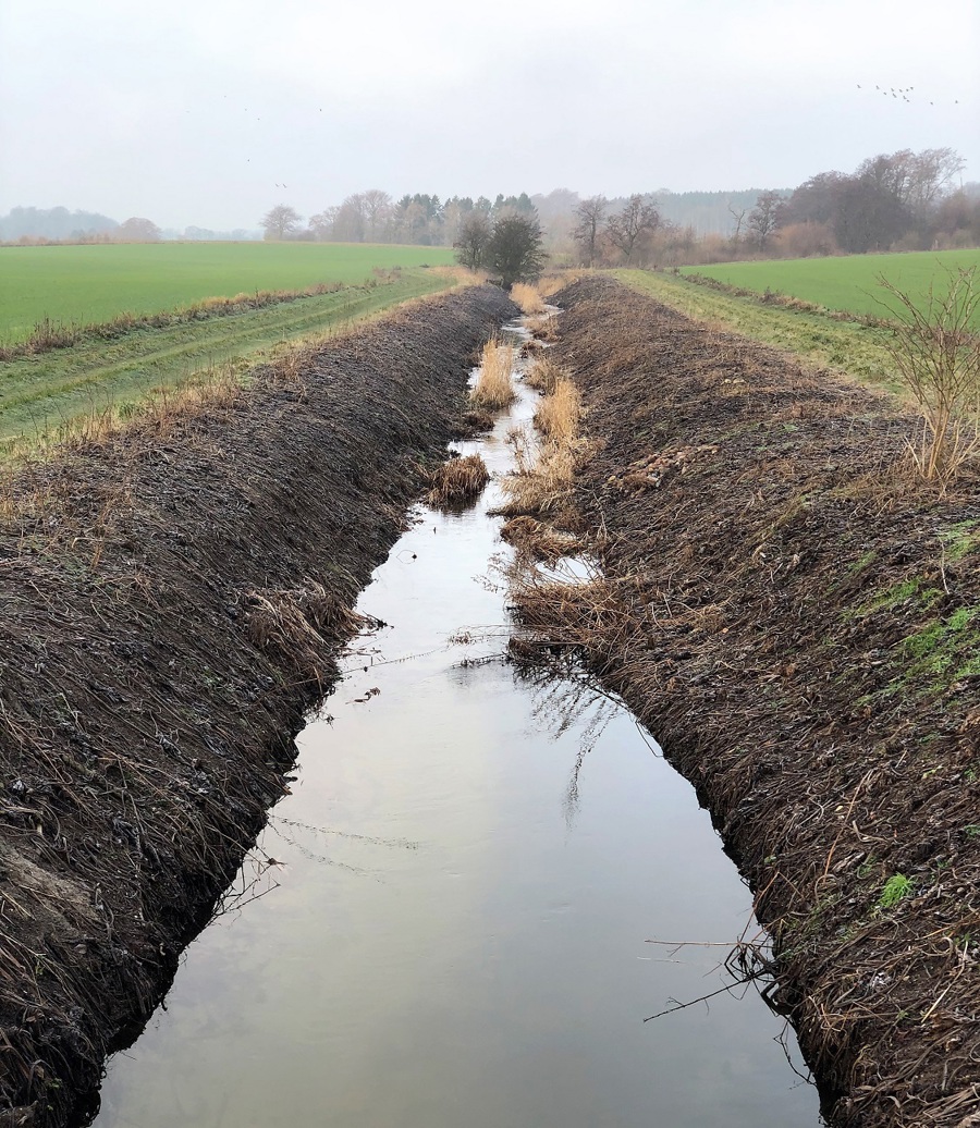 Vi kører videre og passerer igen åen længere nedstrøms, hvor der engang lå en vandmølle, men den spærring er heldigvis for længst væk. Vi studser lidt over brinkerne, der tilsyneladende er helt uden bevoksning, og det ser ud som om, man har kastet bundmateriale op fra åen. Men Søren Jensen forklarer, at det er fordi, brinkerne er tætbevoksede med rød hestehov, og når den visner bort om vinteren, ligger brinkerne helt sorte og åbne hen.