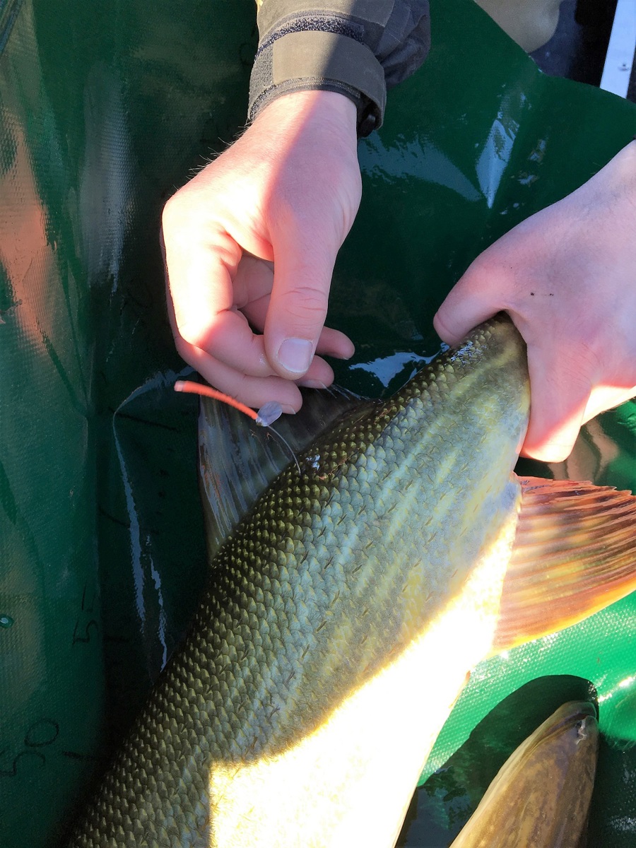 Gedderne bliver mærket med et floy-tag ved rygfinnen.