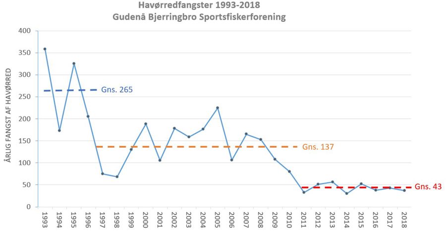 De seneste ca. 20 år har lystfiskerne omkring Bjerringbro ikke fanget nær så mange havørreder i Gudenåen som tidligere. Det skyldes en halvering af fangsterne sidst i 1990’erne og et endnu større fald omkring 2010.