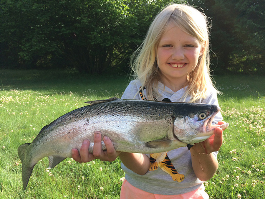 Det var Marie Bang på otte år, der stod for dagens overraskelse, da hun var på fisketur sammen med sin far Johannes Bang lørdag den 24. juni.