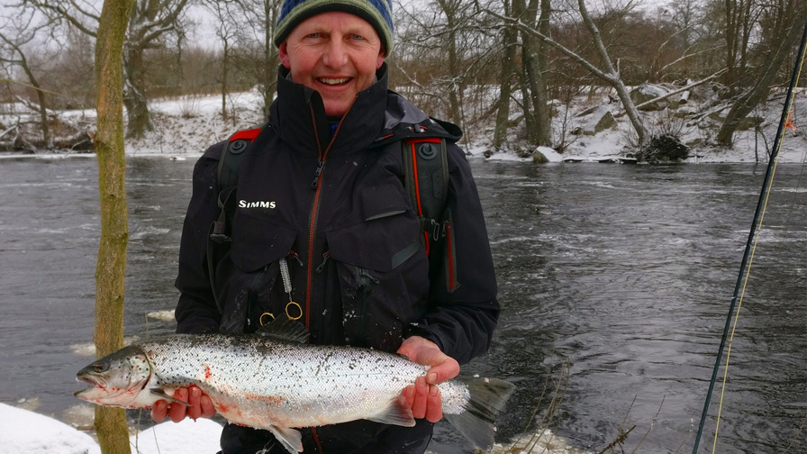 Fiskeriet var trægt i startens snebyger, men indimellem brød solen igennem, og netop i solskinnet fik John Christensen fra Aarhus en meget fin ”Blänkare” (svensk udtryk for blankfisk) på den orange flue nederst på Pool 1. John, der var 19 ture i Mørrum, før han fik sin første fisk på land, behøvede kun fire kast, før havørreden tog fluen ved dette års premiere.