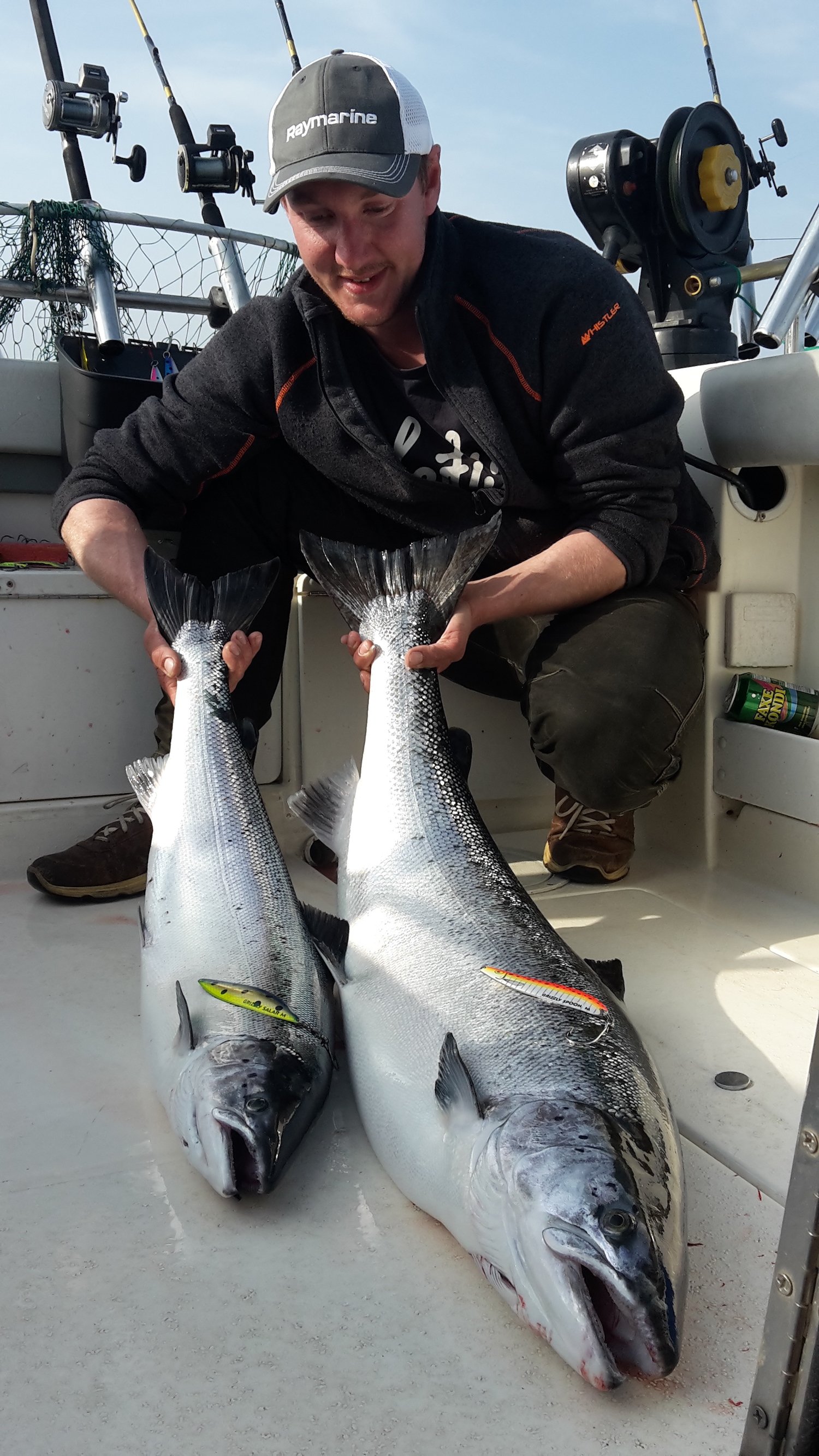 Rasmus Hachmann har tag i de to laks, som kom i båden på turen. Den største på 13,6 kg var ny bådrekord.