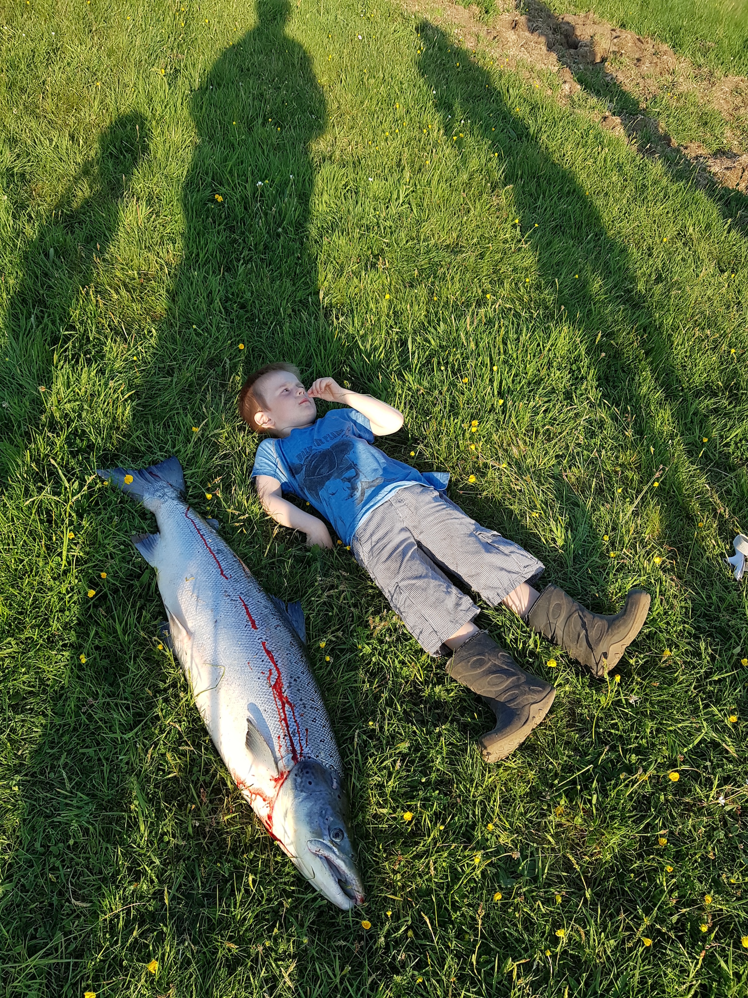 Lodsejerens søn agerer måleband ved siden af den imponerende fisk.