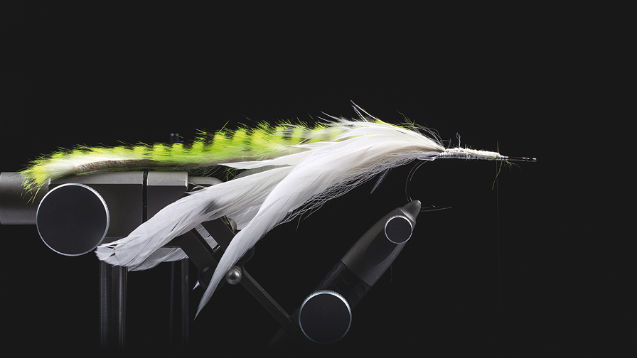 Hale/vinge: Hvid bucktail + 4 hvide schlappenfjer + tiger barred kaninstrimmel i chartreuse/white