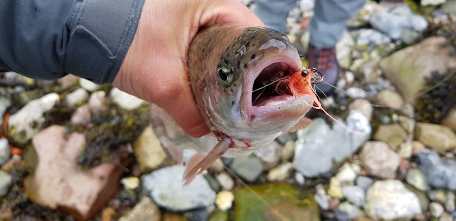 Den usædvanlige fangst fandt sted den 29. april i år på en kystplads på Sydsjælland. Kim fik hug af en regnbueørred, og mens han fightede den, trak den over mod Martin og huggede på hans flue også. Da de fik fisken på land, sad Martins flue, som den tog til sidst, dybest i svælget på den.