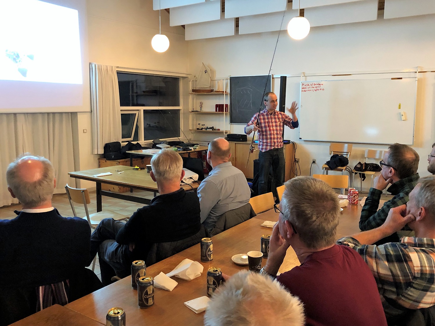 Uffe Clemmensen fortæller blandt andet de fremmødte om Ugefisken, hvor de medlemmer, der har tid og lyst, mødes ved klubhuset i Veddelev hver onsdag kl. 10 for at tage ud på kysttur. Vejrforholdene på dagen afgør fiskepladsen. Klubhuset er også rammen om de ugentlige klubaftener næsten hver torsdag i vinterhalvåret. Her står den lige nu på fremstilling af spinnere og fluer.