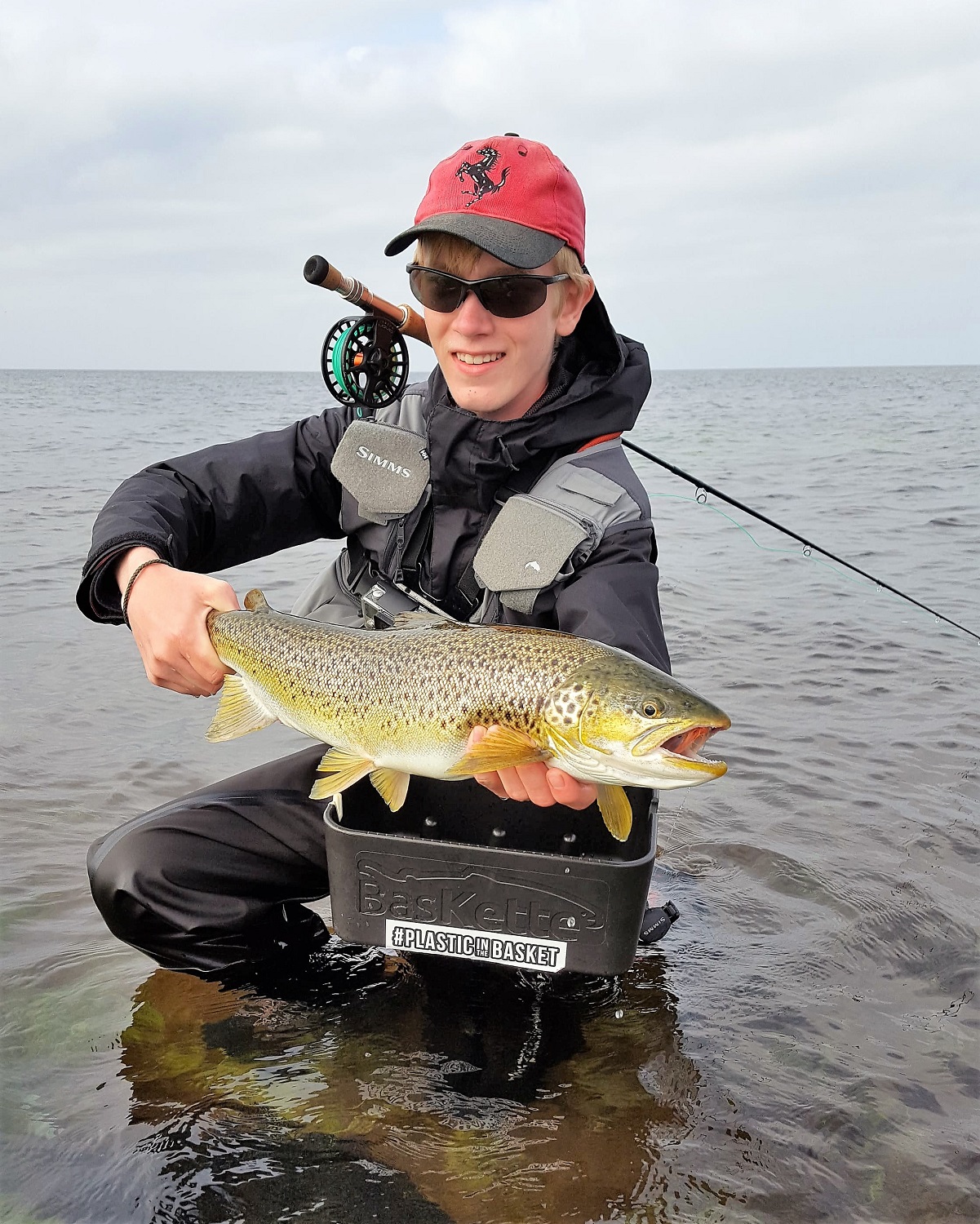 – Jeg bliver guidet ud på en plads af Morten Have, en af de voksne, og jeg får trukket linen af hjulet. Fluen lander 15 meter ude, og jeg får yderligere taget noget line at hjulet og stripper lidt line ind. Dette blev dog hurtigt afbrudt af et godt hug. Fighten forløb rimelig roligt, og fisken gik dybt uden at springe helt vildt. Jeg var dog meget nervøs for at tabe den, da jeg dagene forinden havde prøvet at miste to gode fisk, fordi linen blev skåret over. Dog blev den sikkert nettet af Morten, og vi kunne endelig juble. Fisken målte omkring 60 cm og var i den smukkeste gydedragt og blev selvfølgelig nænsomt genudsat.