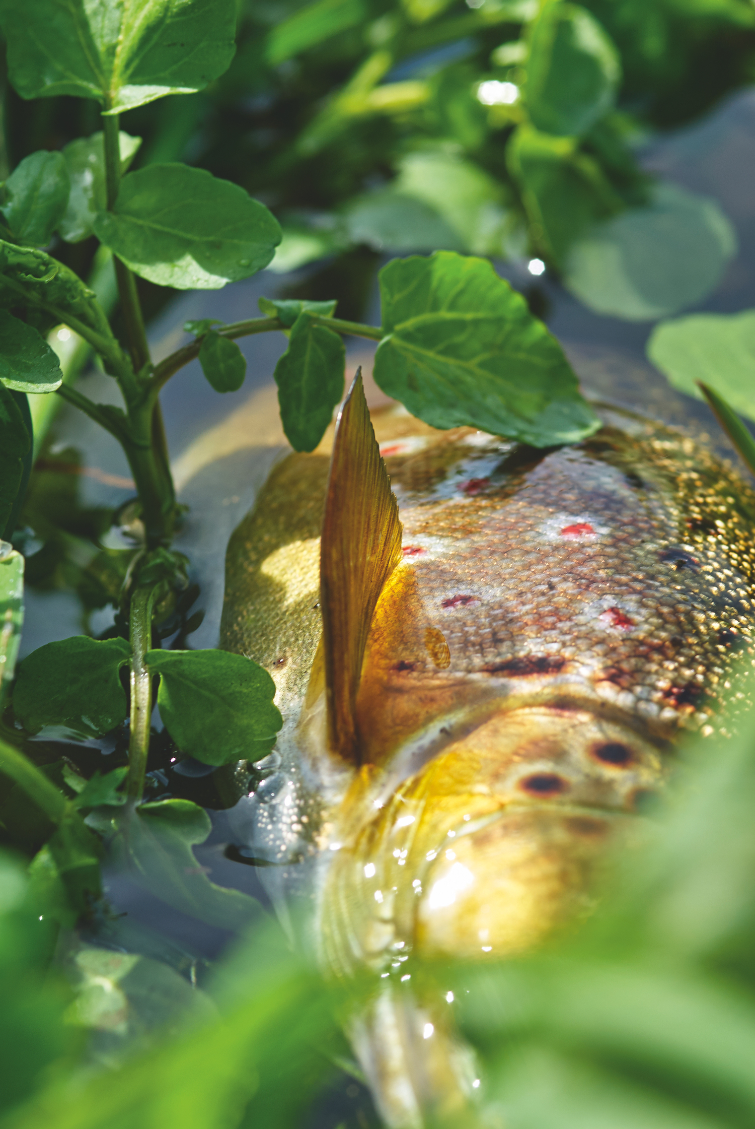Jeg går tilbage til udgangspositionen og tager den lidt med ro. Da den bagerste fisk igen viser sig, sidder jeg nærmest ret ud for den. Kastet bliver mere dappet end kastet ud, men fisken er ligeglad. Den tager brutalt fluen, mens den streamer en anelse og giver en herlig fight. Da den ligger i de sorte netmasker og genvinder pusten, kan jeg beundre dens brede ryg og det smalle, spidse hoved. De bliver ikke smukkere. Da den stille svømmer ud gennem grøden, retter jeg mig op. Kun én tanke er tilbage. Større! Jeg må fange en, der er større!
