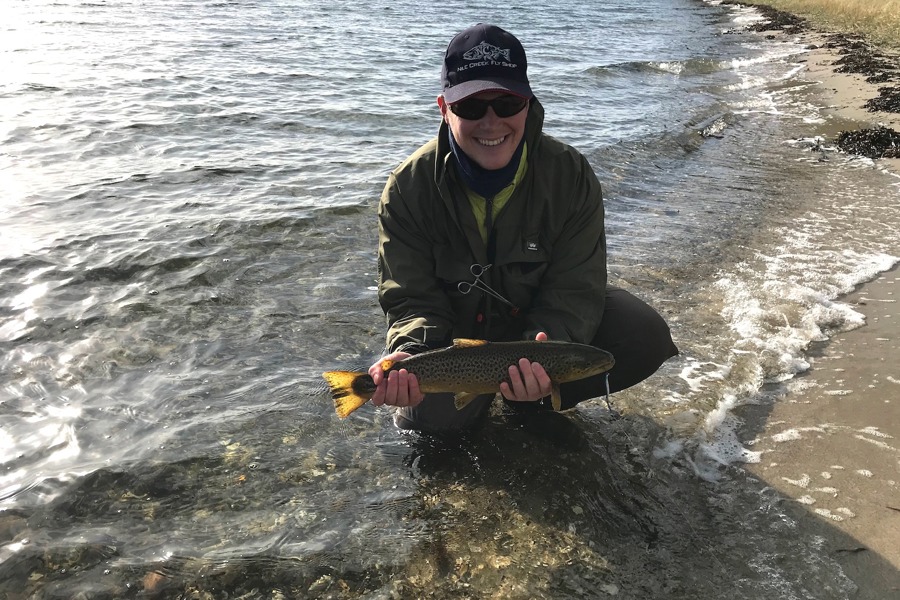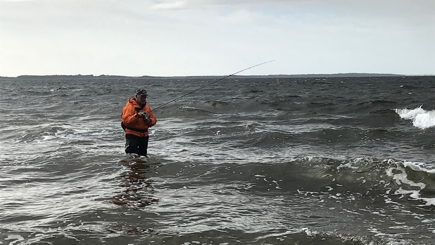 – Efter en kort intro om havørredens adfærd på Fur gennemgik vi grejopsætning og gik i gang på dagens første fiskeplads på sydvestsiden af Fur. Jeg vidste, at vinden ville blusse op til 11 meter i sekundet, og efter halvanden time blev det for farligt at fiske der på grund af ekstremt høj vandstand, rullesten og bølger. Så vi flyttede til mit hotspot på østsiden af Fur, hvor der var lidt mere læ. Her fiskede vi i ca. 2 timer, og der var nogle, der havde flere hug.
