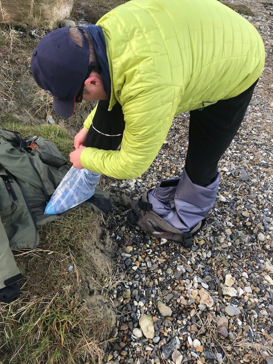 Mikael måtte nødlappe sine waders med en plasticpose. Lapningen holdt i de fire timer, fiskeriet varede.