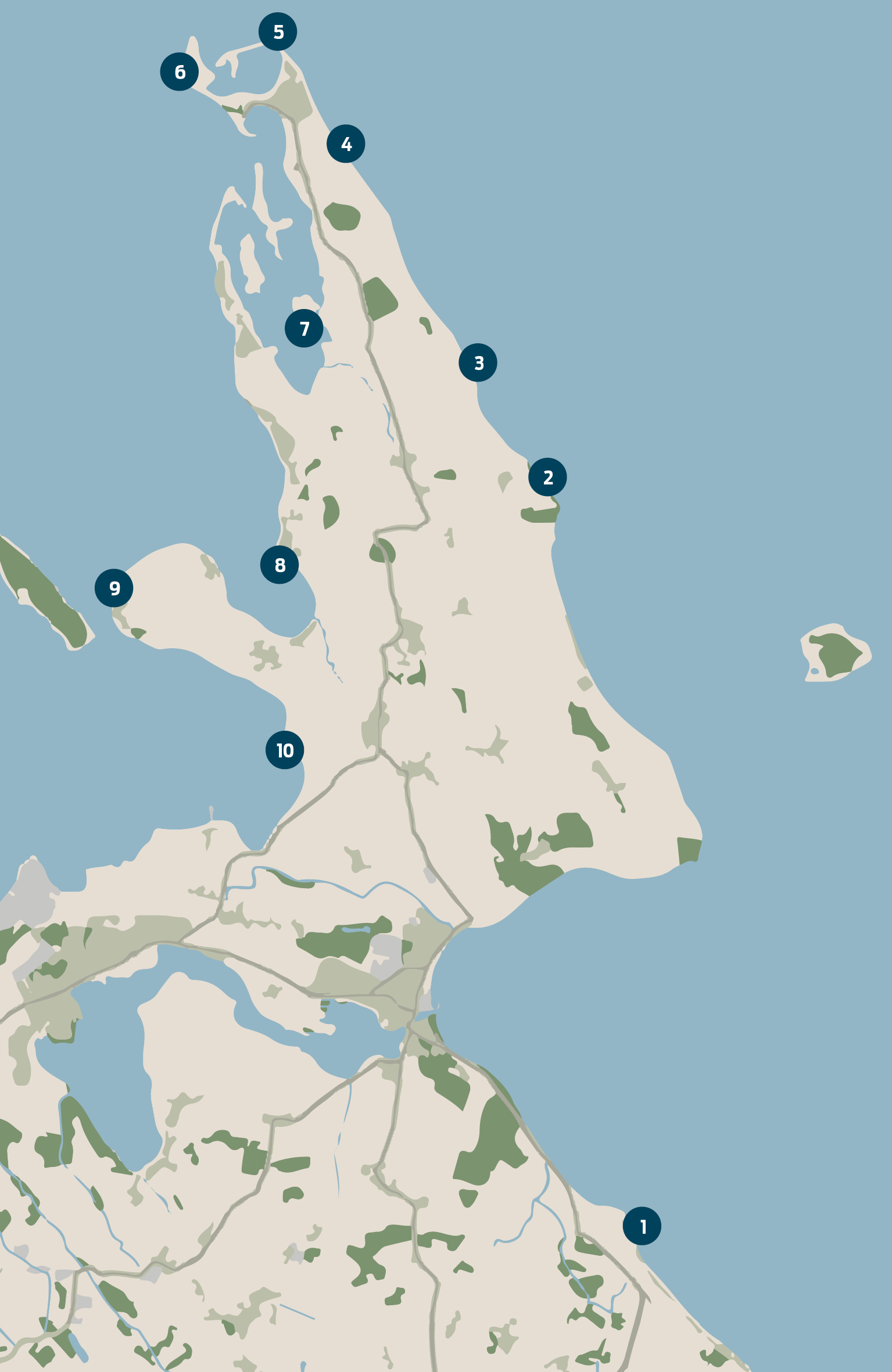 Hindsholm rundt byder på perfekte havørredforhold, og med en størrelse som Samsø er der ovenikøbet kort transporttid mellem fiskepladserne, som ligger som perler på en snor. Uanset vindstyrke og retning kan man på Holmen, som halvøen bliver kaldt af de lokale, inden for meget korte afstande finde en fiskeplads med vindforhold, der gør det muligt at fiske. Dertil er variationen af kystpladser unik. På én dag kan du sagtens nå at fiske over lidt blød bund i Odense Fjord, for derefter at køre til den åbne stenkyst, hvor kastet lægges ud i Kattegat, for til slut at affiske et langt, spændende badekar på Storebæltskysten. Alt det uden at have kørt mere end 20 kilometer samlet, og det sparer dig for spildtid i bilen og giver mere fisketid ved vandet. Hindsholm er med andre ord næsten én stor havørredplads, men lad mig alligevel udpege ti af halvøens hotteste kystpladser, der er særlige for mig.