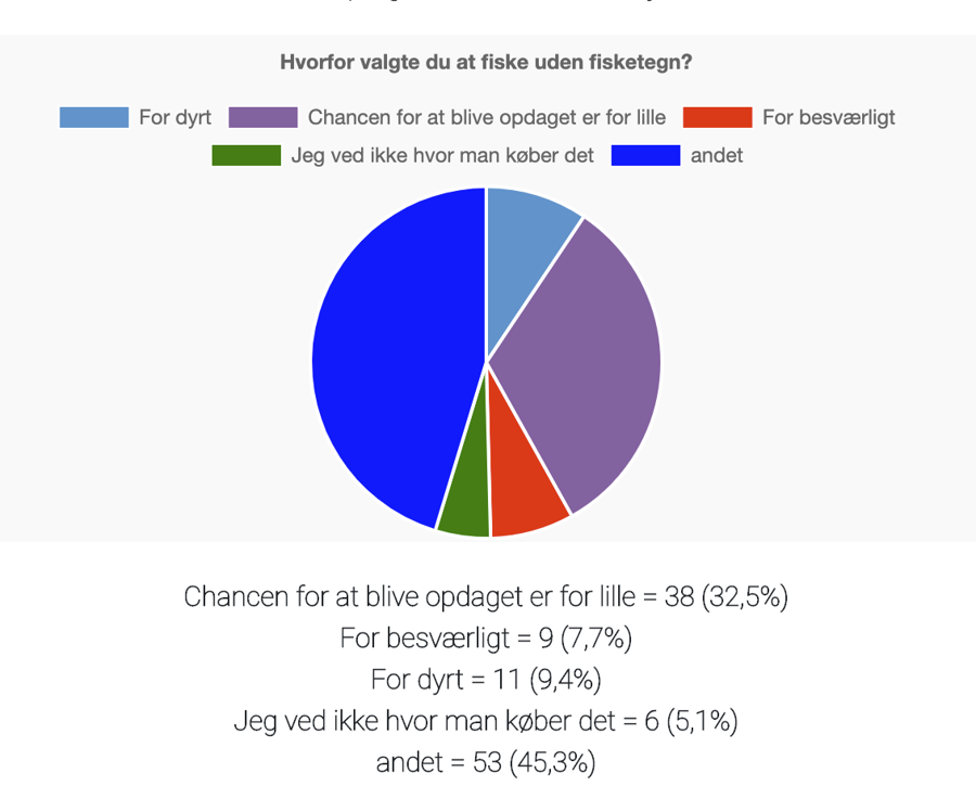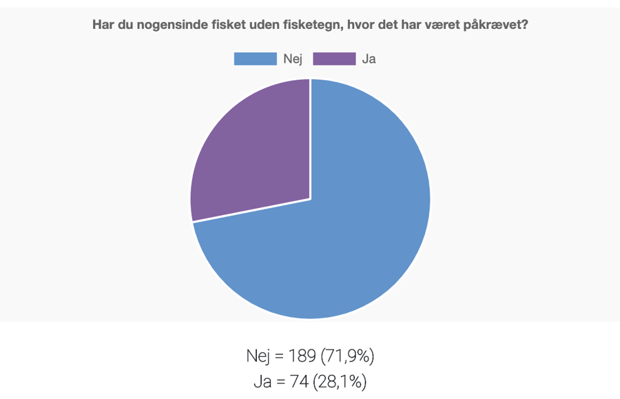En mindre online spørgeundersøgelse, foretaget af indehaver af fiskpaakrogen.dk og lystfisker Lasse Nielsen, viser, at knap en tredjedel af de 306 adspurgte lystfiskere har fisket uden det lovpligtige statslige fisketegn selvom det var påkrævet. 14,1% havde gjort det indenfor det seneste år. Samtidig viser spørgeundersøgelsen, at 33,2% af de adspurgte begrundede det ulovlige fiskeri med, at ”chancen for at blive opdaget er for lille”.