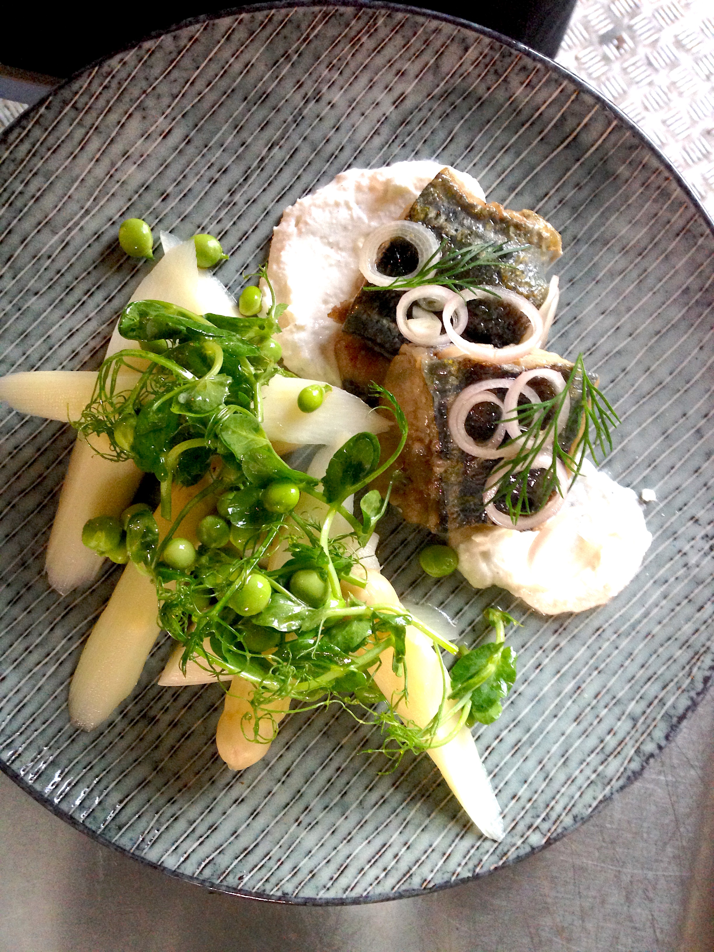 Zuzette Kraft // Pandestegt hornfisk, hvide asparges, spidskål, rødløg og sauce blanquette med Riesling og sennep.