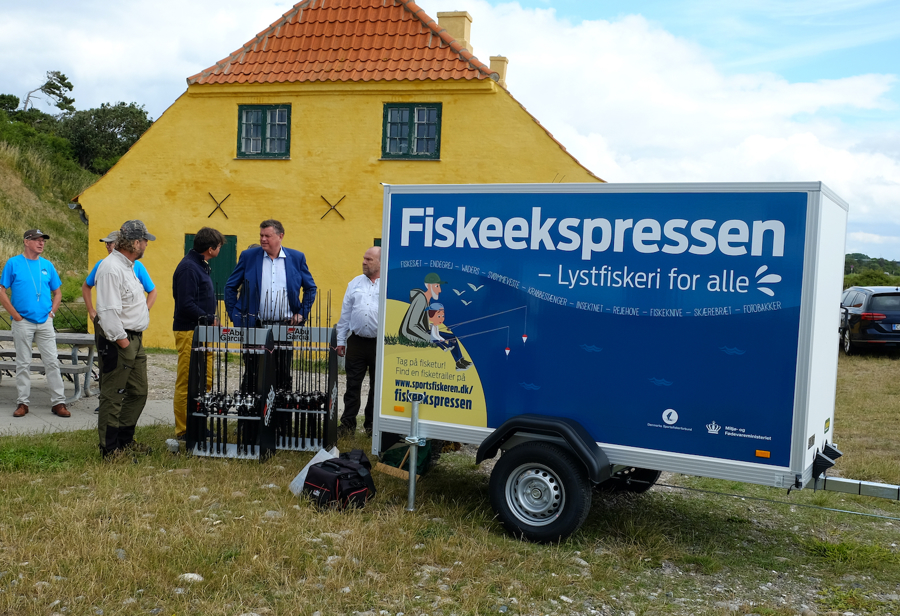 Fiskeriminister Mogens Jensen var i dag den første til at afprøve de nye trailere og det tilhørende fiskegrej ved Halsskov Rev ved Storebæltsbroen, hvor han fiskede sammen med medlemmer af Korsør Lystfiskerforening og Sportsfiskerforeningen Storstrømmen. Her fik ministeren allerede bid af en hornfisk i første kast, og han var da også begejstret for det nye projekt.