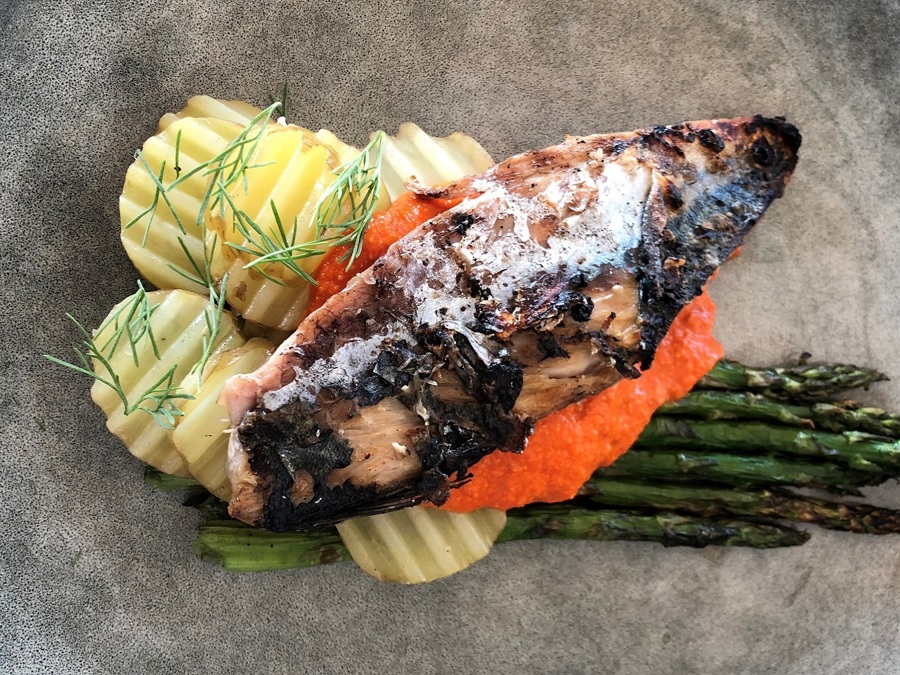 Zuzette Kraft // Grillet makrel med asparges, kartofler og Romesco-sauce
