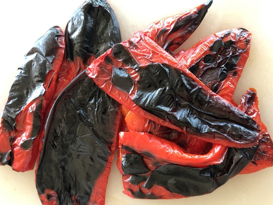 Fire til seks røde snackpeberfrugter halveres, renses og sættes helt oppe under grillen i ovnen med skindsiden opad. De skal grilles, til skindet er kulsort. Når de er sorte, tages de ud af ovnen og kommes i lufttæt beholder, til de er kølet af. Skindet flås af, når de er kolde nok.