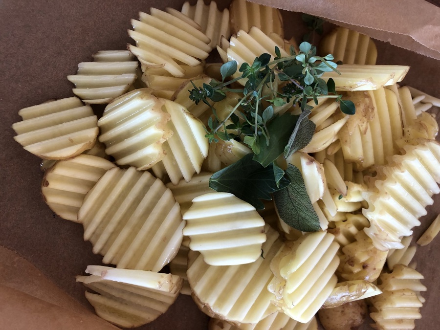 Kartoflerne skæres i 3-4 mm tykke skiver og blandes med olie og krydderurter.