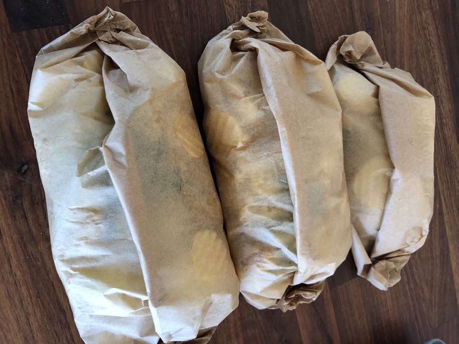 Fordel kartoflerne på 2-3 ark bagepapir, alt efter hvor mange der er, og pak dem ind, så papiret slutter nogenlunde tæt. Klar til grill.