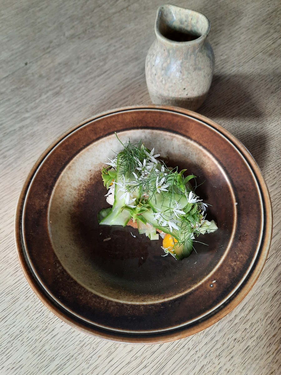 Søren Knudsen // Makrel med saltet og syltet agurk, æggeblomme-creme og sauce på karamelliseret kærnemælk