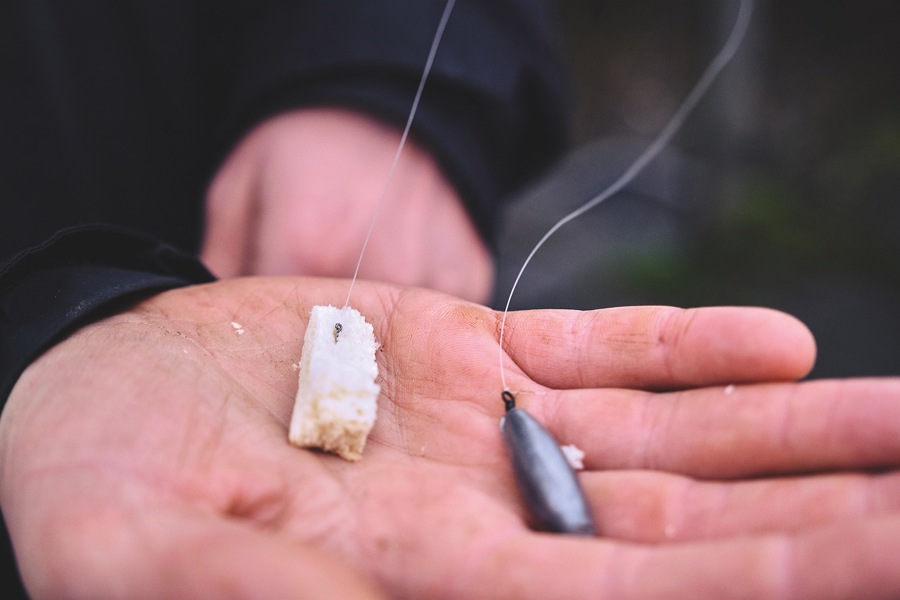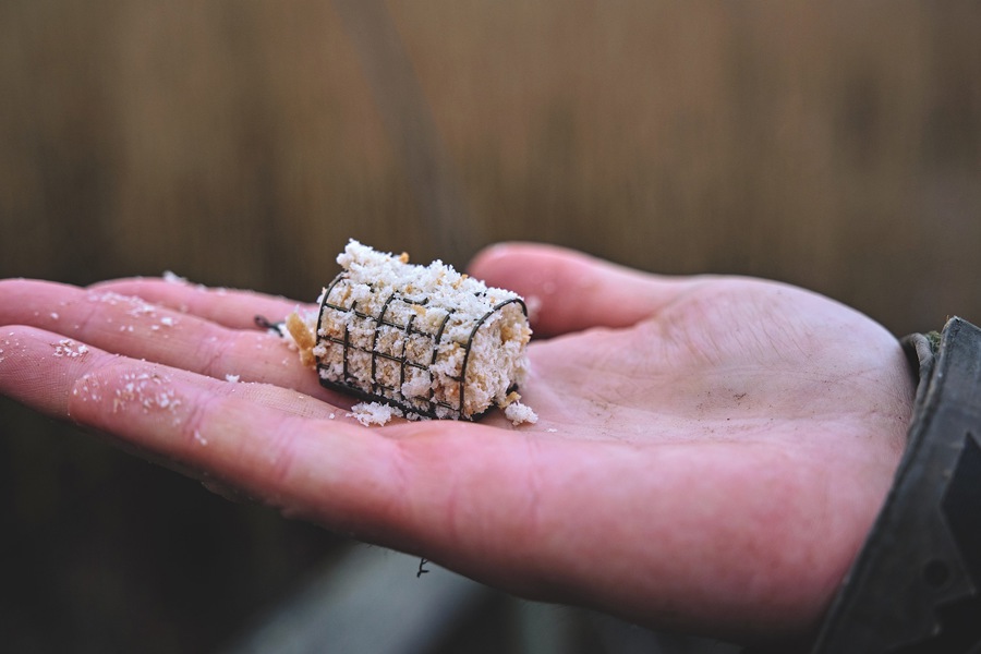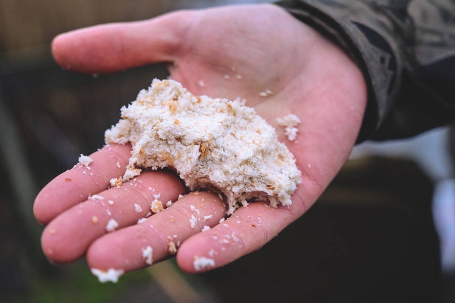 - Det findelte brød kan også nemt presses sammen til en kugle, der kan kastes ud og som går i opløsning, mens det daler ned gennem vandet. Som udgangspunkt fodrer jeg også kun op én gang, når jeg fisker i de kolde måneder. Det gælder både søer og åer. Ved fiskeri i søer tilføjer jeg groundbait til brødet, så jeg fodrer med 3 dele groundbait til 1 del brød.