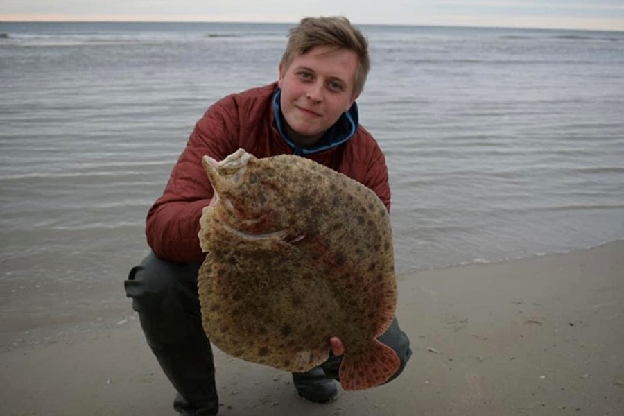Ebbe laver kurser i pighvarfiskeri for Danmarks Sportsfiskerforbund. Her har han fundet en af de rigtig store plader.