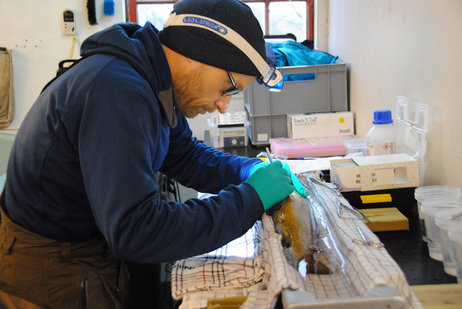 Jon Christian Svendsen indopererer en transmitter i en af fiskene i klækkehuset.