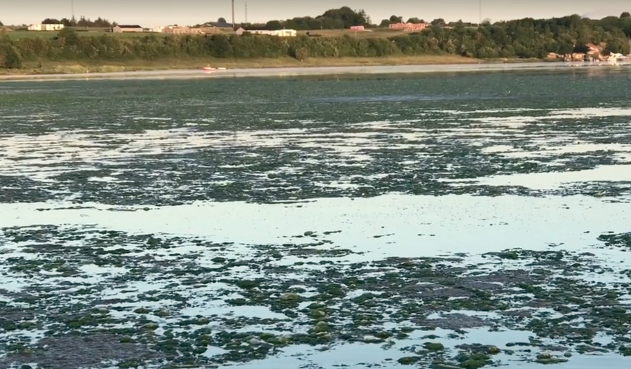 Henrik Leth dokumenterer den 8. juni 2018, hvordan grønalger fylder mere og mere i den hårdt pressede Mariager Fjord. Det eneste liv på det lave vand er tanglopper.