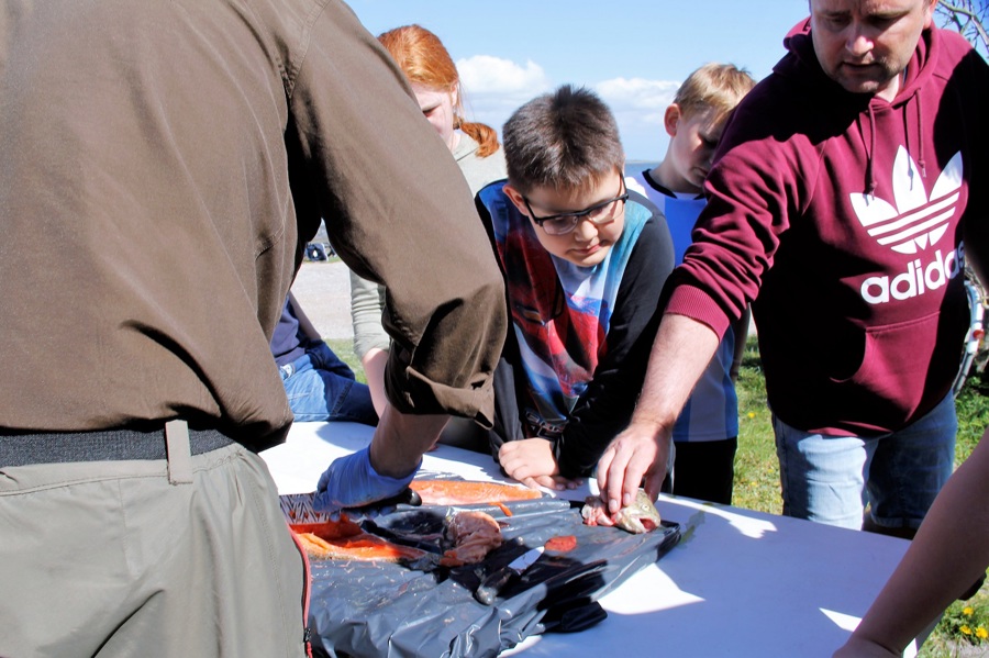 Her står folkene fra Fiskeskolen Fyen, der er et initiativ under Odense Sportsfisker Klub, klar til at tage imod dem, og Henning Jacobsen har medbragt en ørred, som de sammen dissekerer. Indvoldene bliver taget ud, og Henning fortæller om de enkelte dele og om fiskens sanser. Derefter bliver fileterne pakket i folie og tilberedt, så børnene senere kan få en smagsprøve.