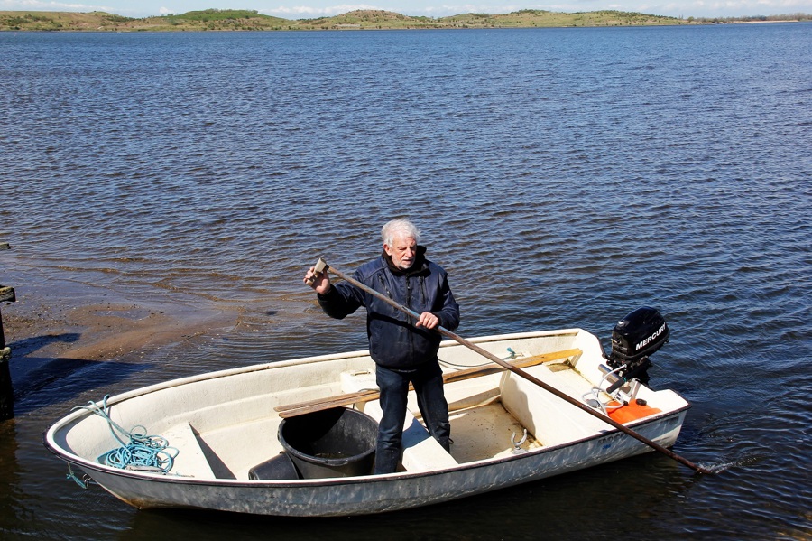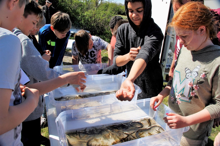 Senere kommer Kurt Christensen ind med sin jolle. Han har været ud at tømme sine ruser og har dagens fangst med i en stor, sort balje. Indholdet bliver fordelt i plastickar, så børnene kan undersøge og røre ved indholdet. Der er et par ål, en enkelt ålekvabbe, et par kutlinger og en masse trepiggede hundestejler. Børnene synes, det er vildt spændende at røre ved fiskene.