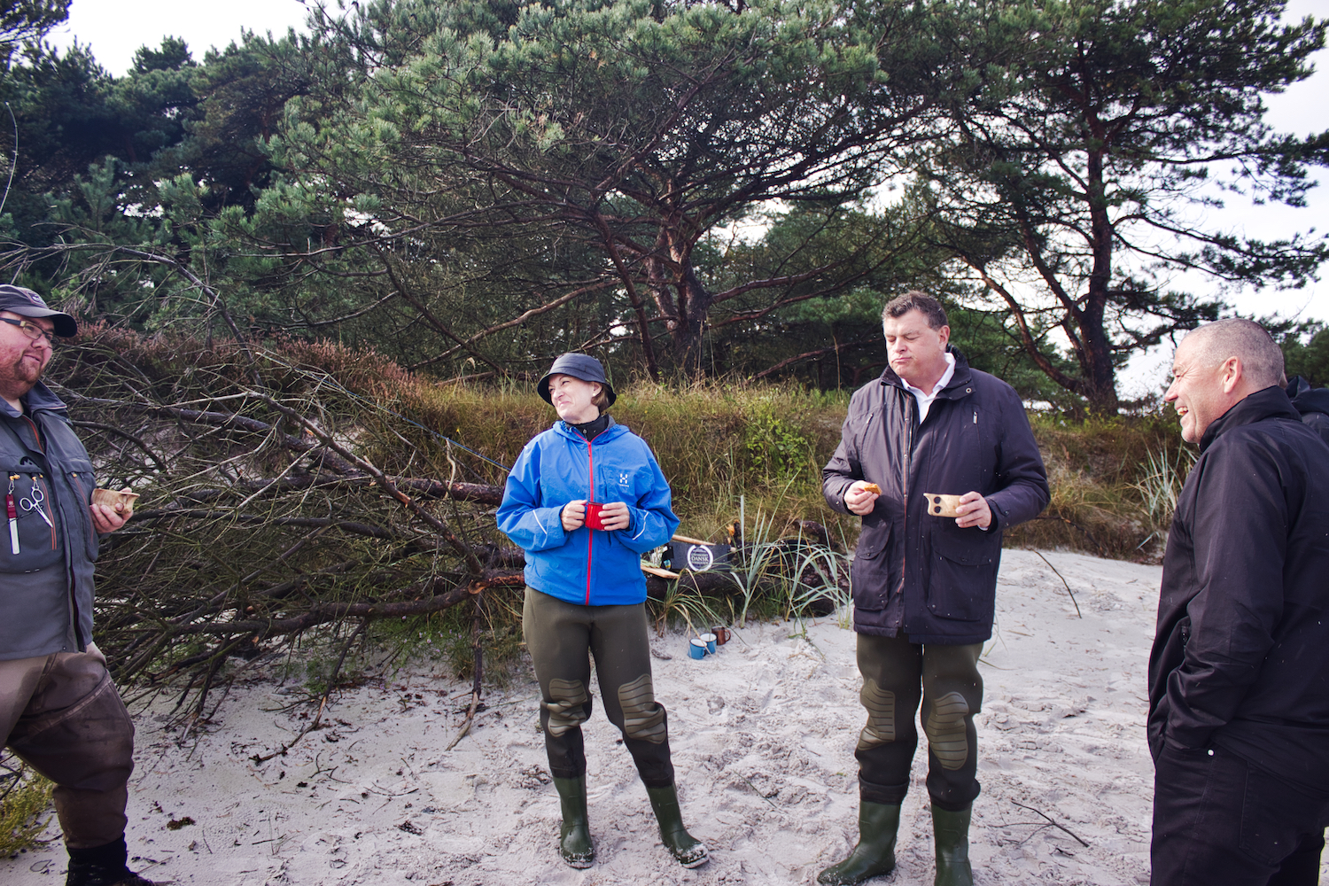 Under snakken mellem Simon Rømer fra Bornholms Sportsfiskerforening(tv), Pernille Lydolph fra Destination Bornholm(midten) og fiskeriminister Mogens Jensen(th) var der også tid til lidt kogekaffe på stranden og en bornholmsk kiks.