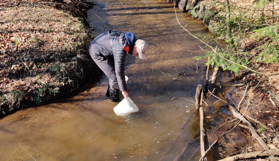 En medarbejder fra DTU Aqua udsætter en portion mærkede havørredsmolt i Skibelund Bæk.