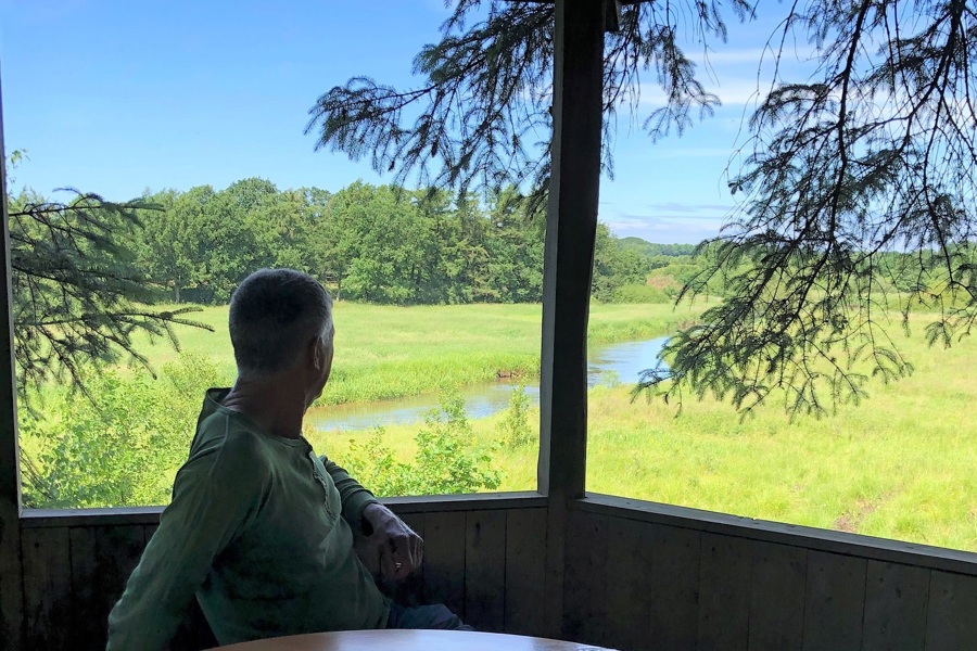 Fra sin udsigtspost tæt på sin bolig ved Kongeåen kan Michael følge med i, hvad der sker ved åen.