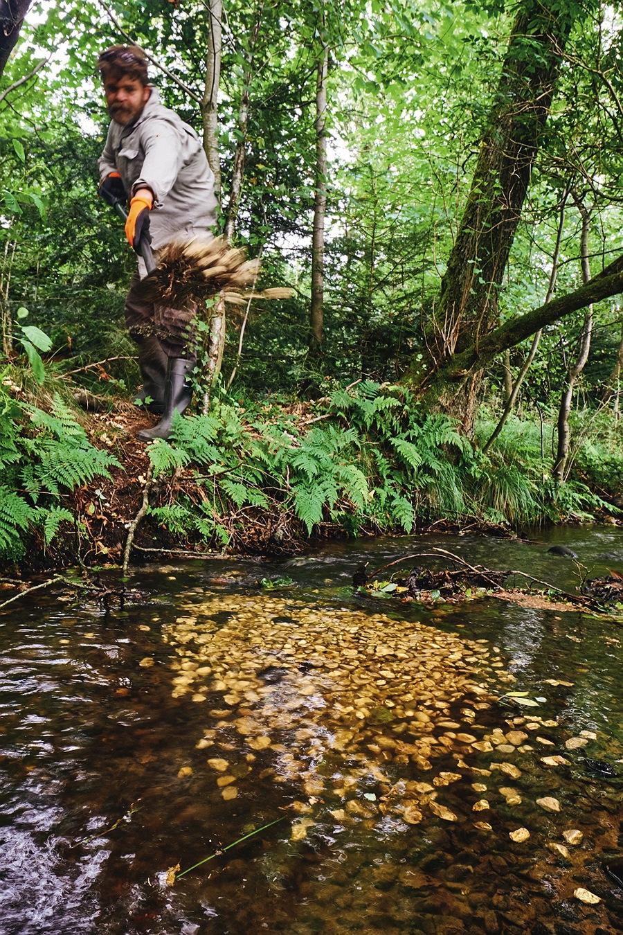 Det er lummert i vejret, denne dag sidst i juli, da jeg besøger Torben og "Stenbiderne", der knokler i et lille tilløb til Vegen Å i en sommergrøn skov nogle kilometer fra Holstebro. Ved vandløbet står 8-10 mænd i gummistøvler, der alle har en forkærlighed for fisk og natur. Derudover er de egentlig vidt forskellige, for Stenbiderne er en løst organiseret flok af lodsejere, lystfiskere og lokale fra en række forskellige foreninger, der er gået sammen om en fælles sag: natur- og fiskerige vandløb.