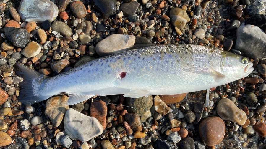 Undermålshavørred med tydelige mærker efter nærkontakt med skarv. Denne slap fra det med livet i behold, men både vilde og udsatte smolt er særligt udsatte i april måned.