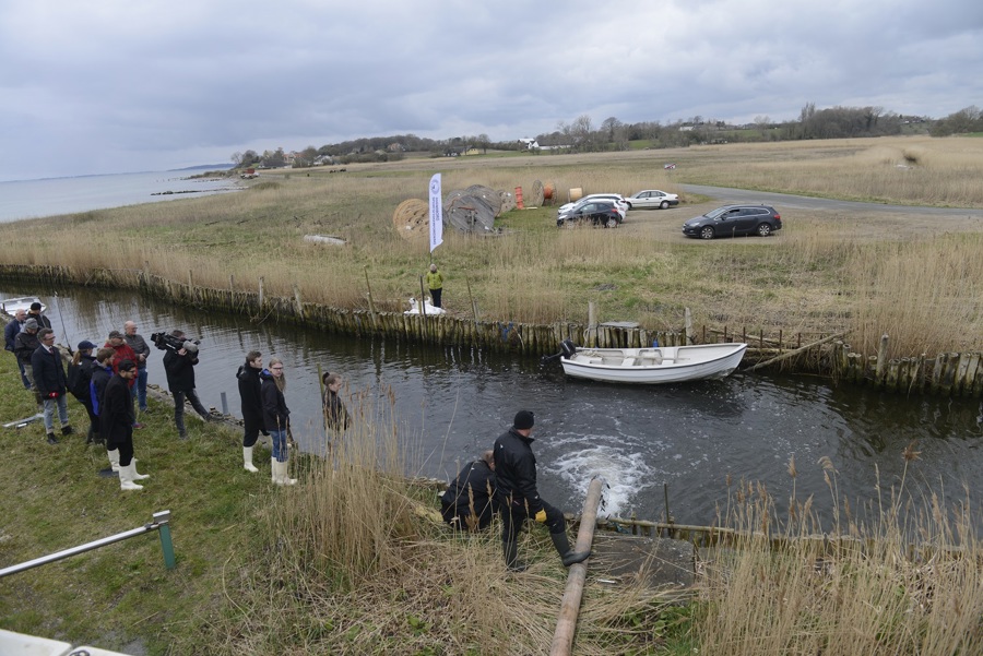 I de første dage efter udsætning er smoltene særligt udsatte for skarv og andre prædatorer. Her sættes smolt ud i Syltemade Å ved Svendborg.